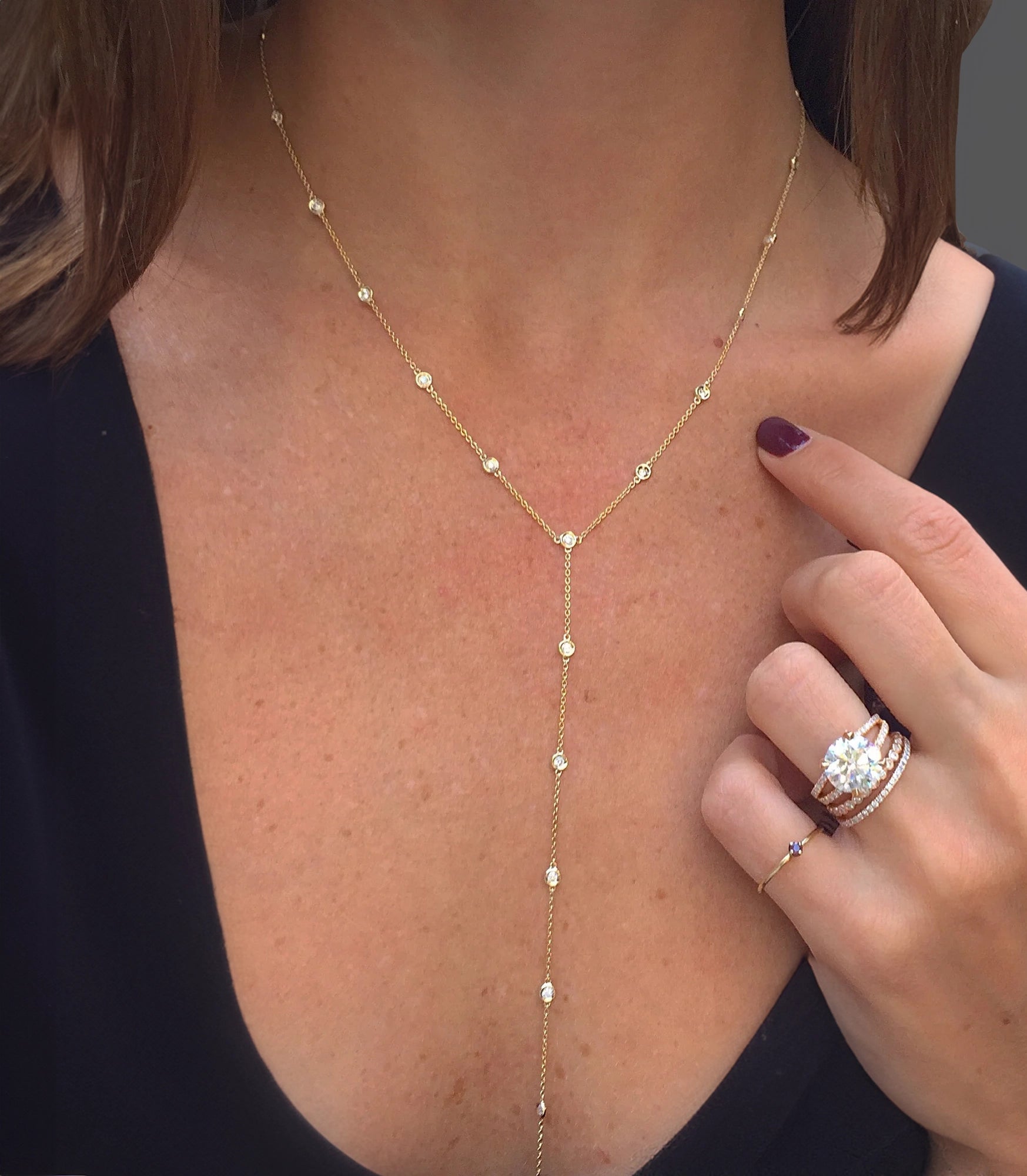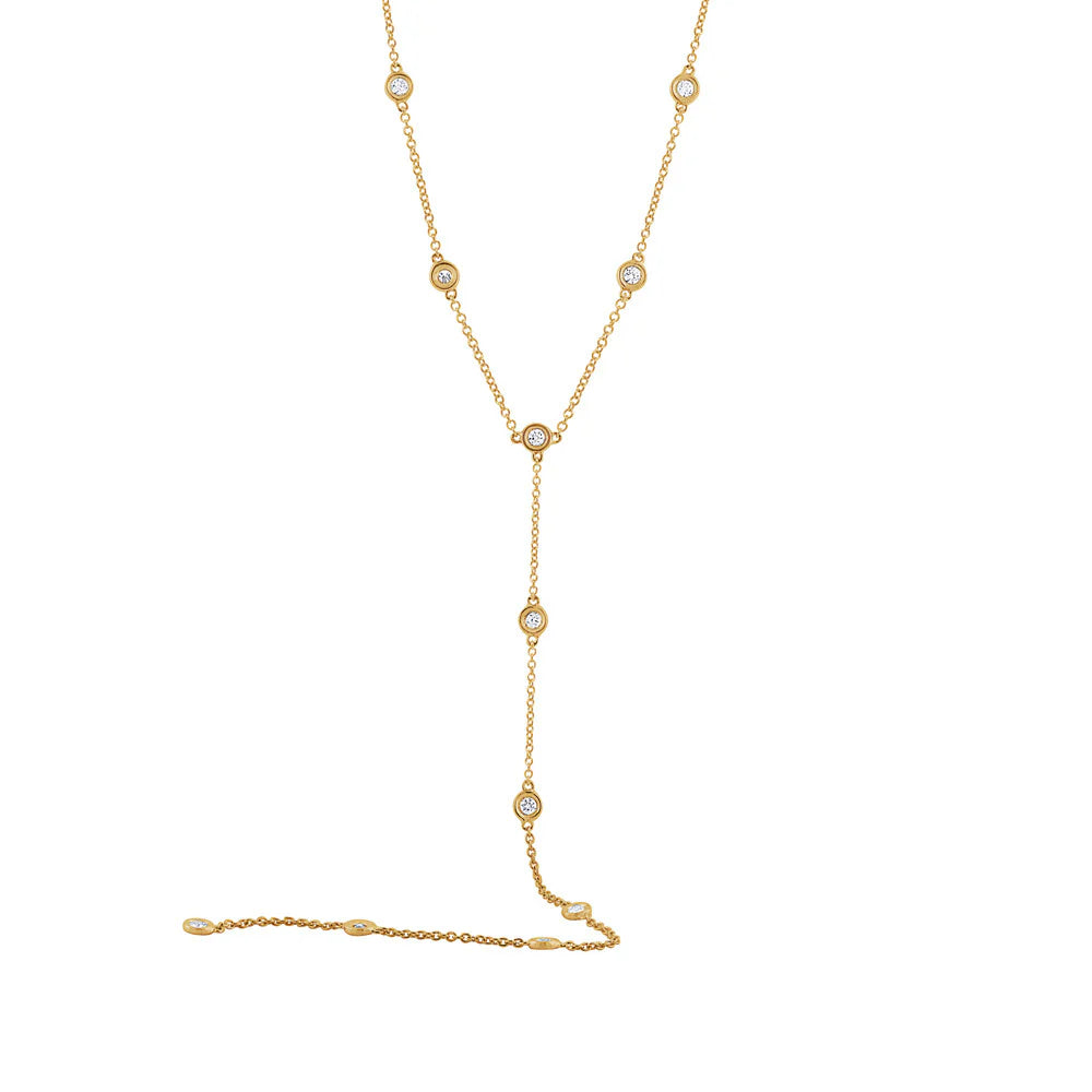 This Diamond Bezel lariat necklace adds 19 diamonds to your neckline and body, topping off your look.