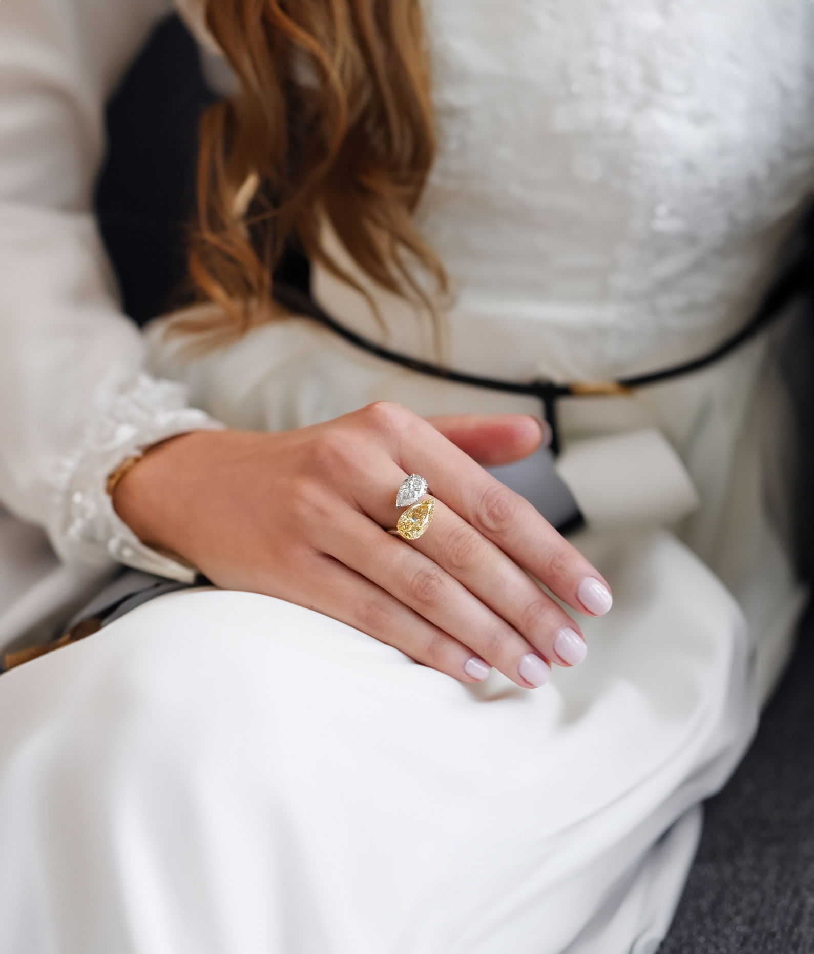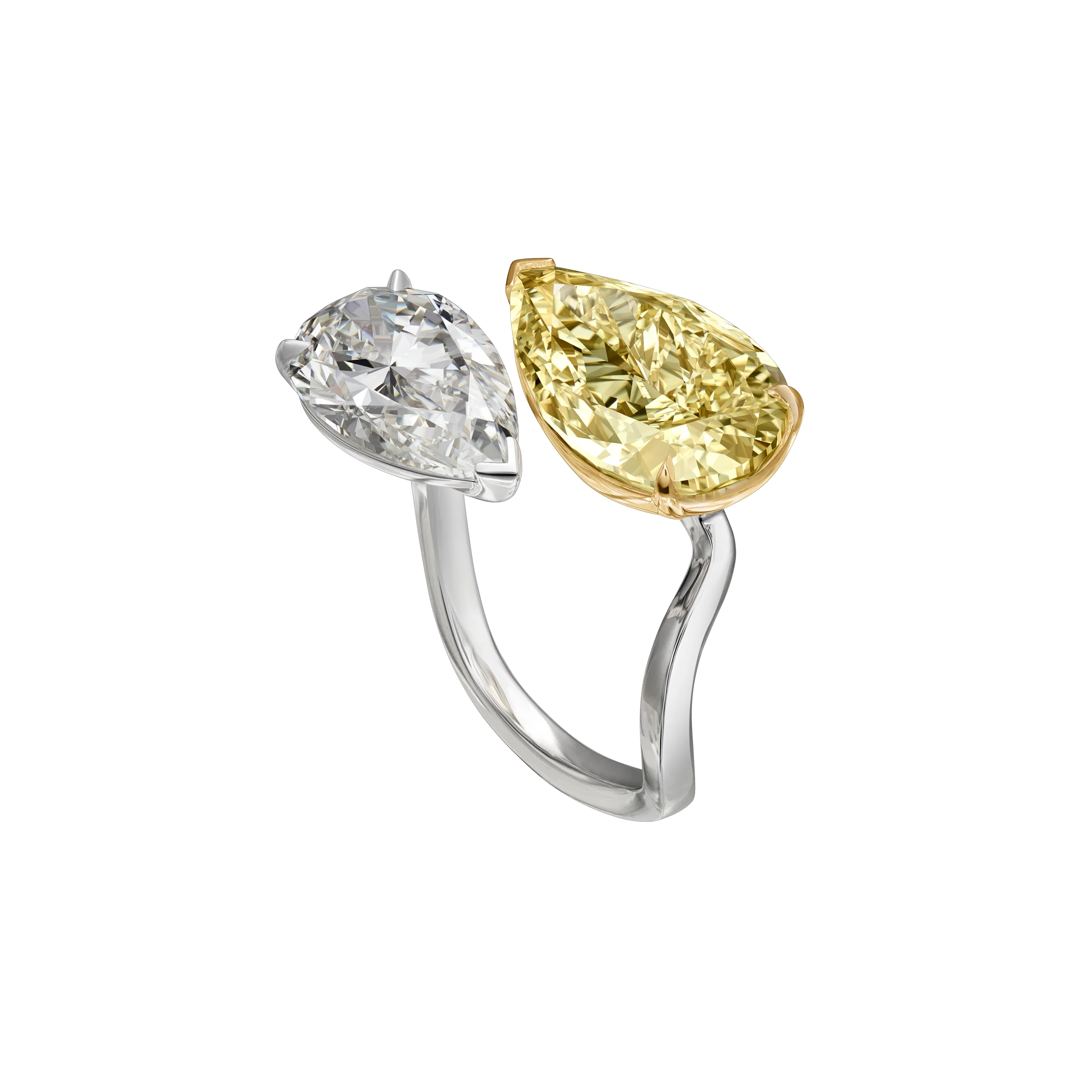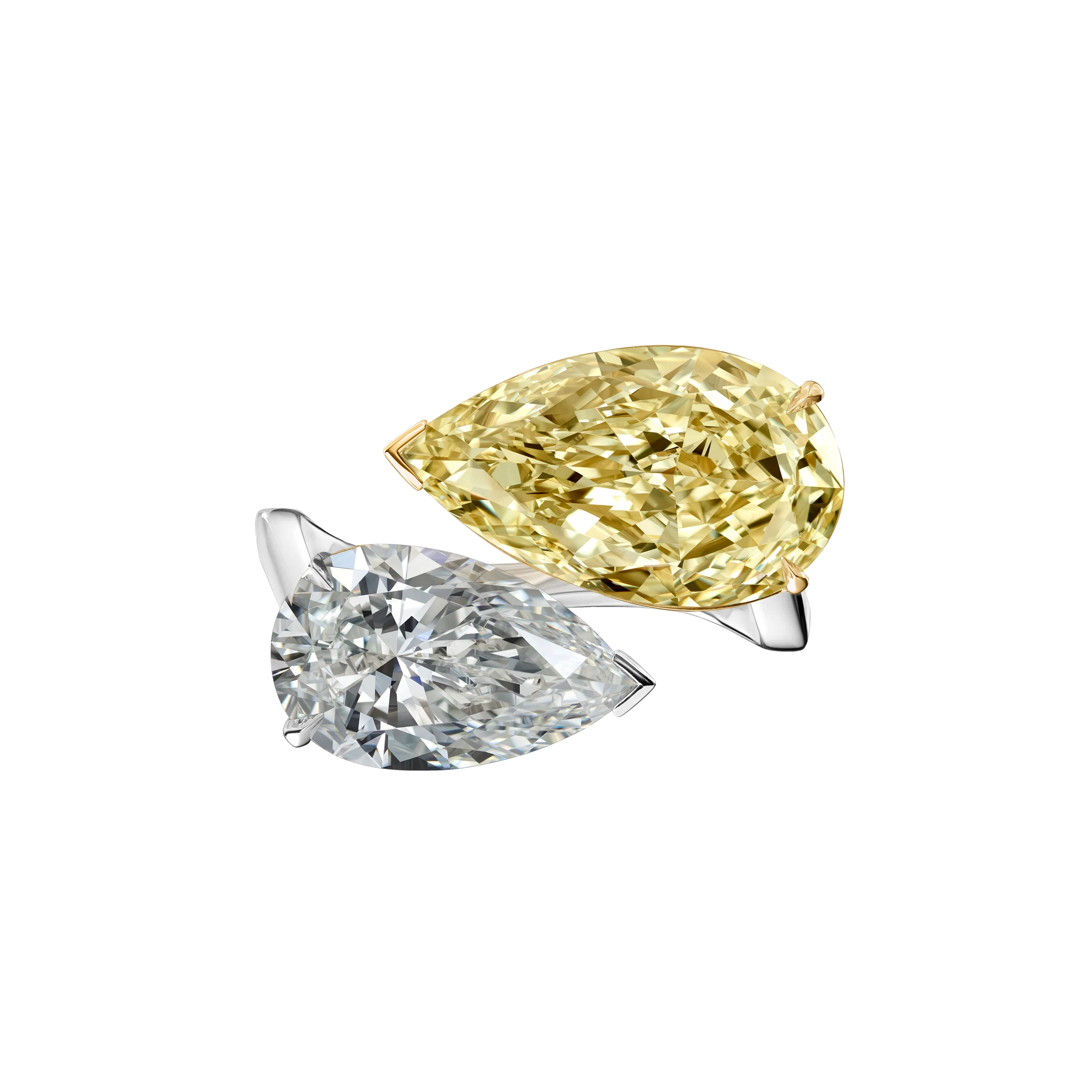 5.03 carats of yellow pear-shape diamond and a 3 carat of pear-shape diamond set by hand in white gold.
